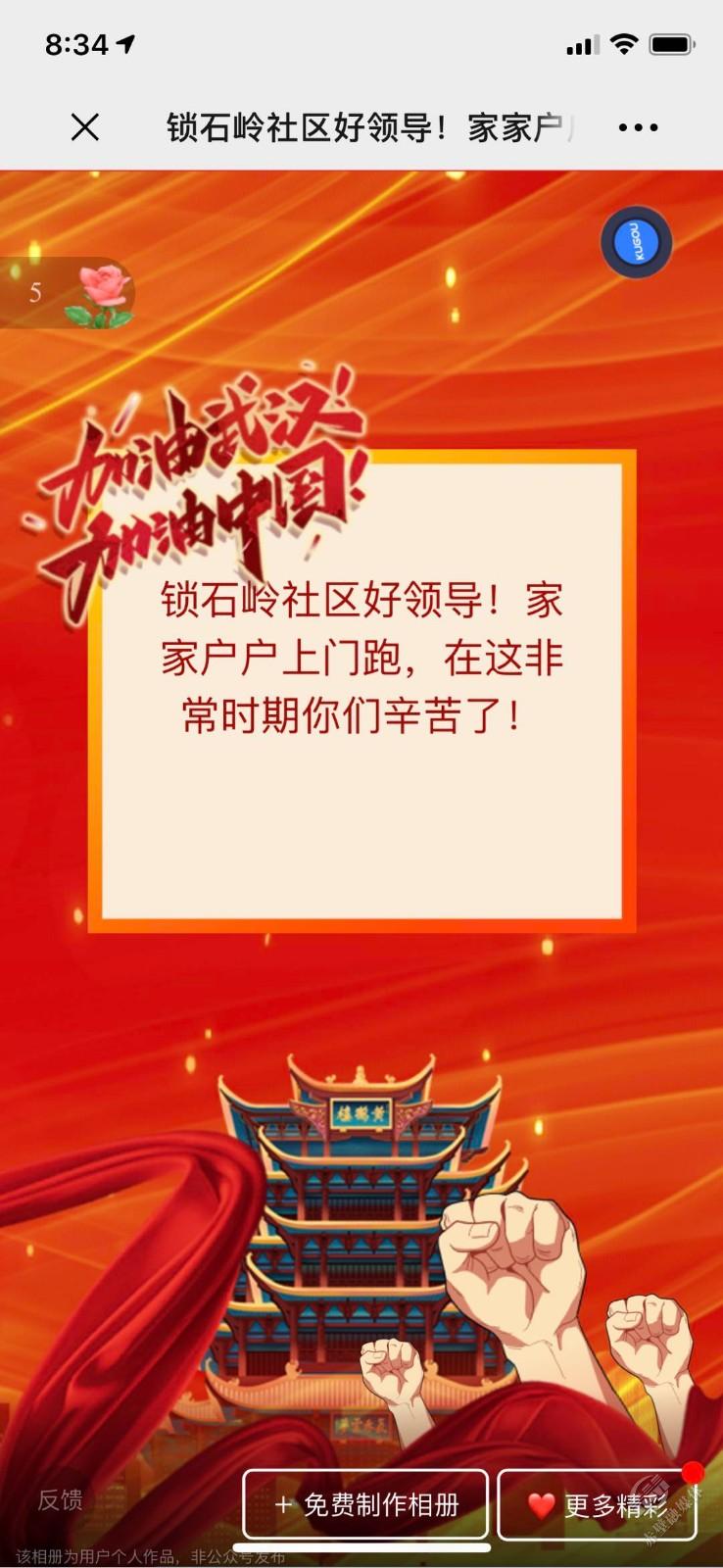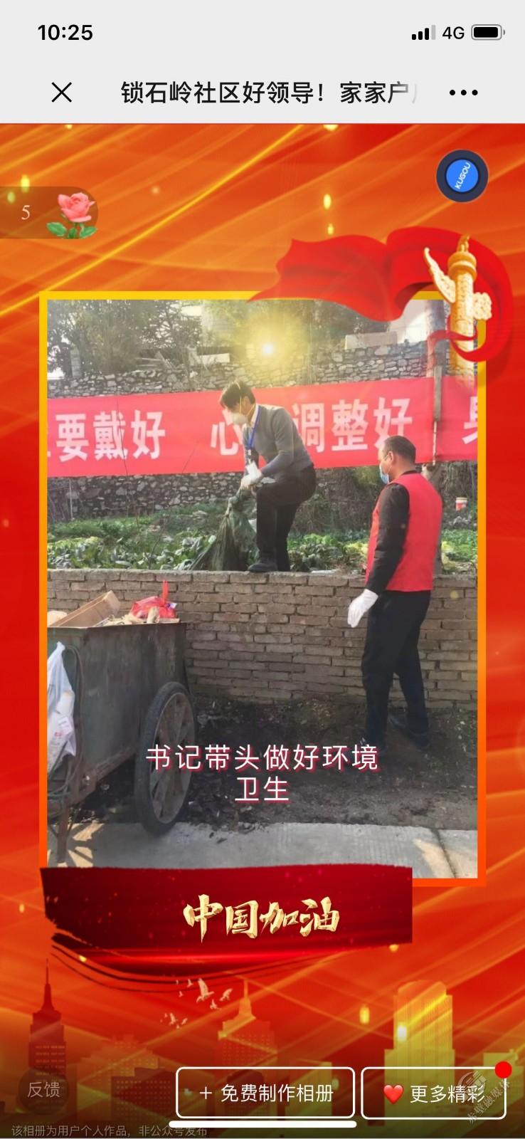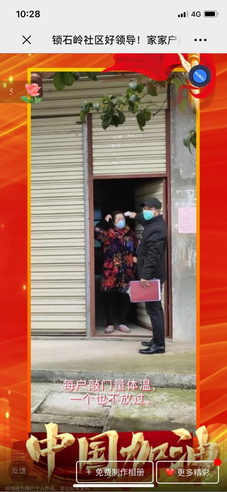 原来,这是一本记录了锁石岭社区干部、村医、党员志愿者们防疫日常的电子相册。相册的制作者是该社区的居民,她通过群消息、自己拍摄、朋友圈等渠道细心的收集到这些照片,并为每一张图片都配上文字解说,以表达自己对他们的感谢之情。