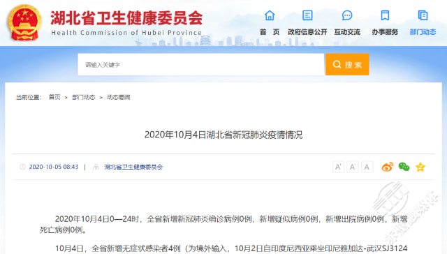 10月4日,全省新增无症状感染者4例(为境外输入,10月2日自印度尼西亚乘坐印尼雅加达-武汉SJ3124航班抵达武汉天河机场),转确诊0例,解除隔离0例,尚在医学观察的无症状感染者4例(其中境外输入4例,武汉市4例)。
