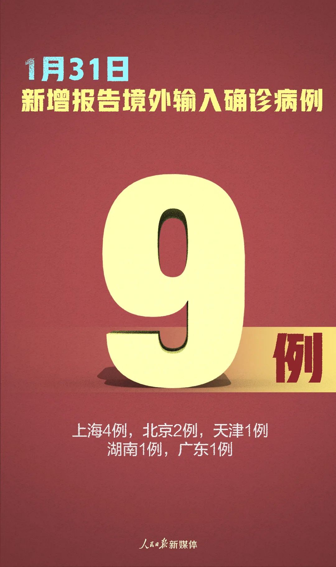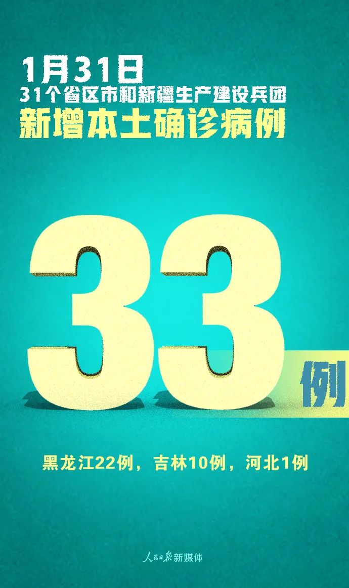 1月31日0—24时,31个省(自治区、直辖市)和新疆生产建设兵团报告新增确诊病例42例,其中境外输入病例9例(上海4例,北京2例,天津1例,湖南1例,广东1例),本土病例33例(黑龙江22例,吉林10例,河北1例);无新增死亡病例;无新增疑似病例。