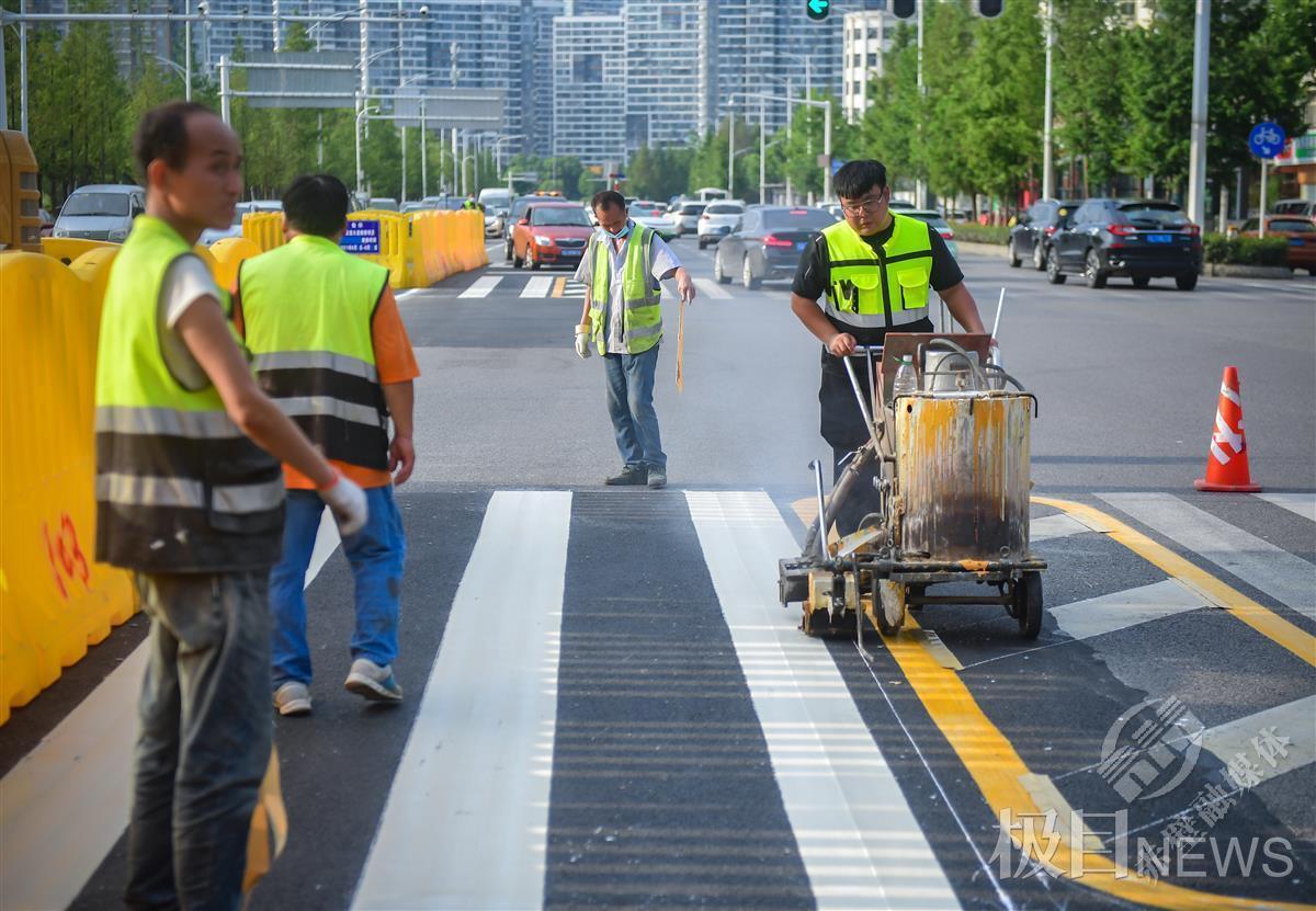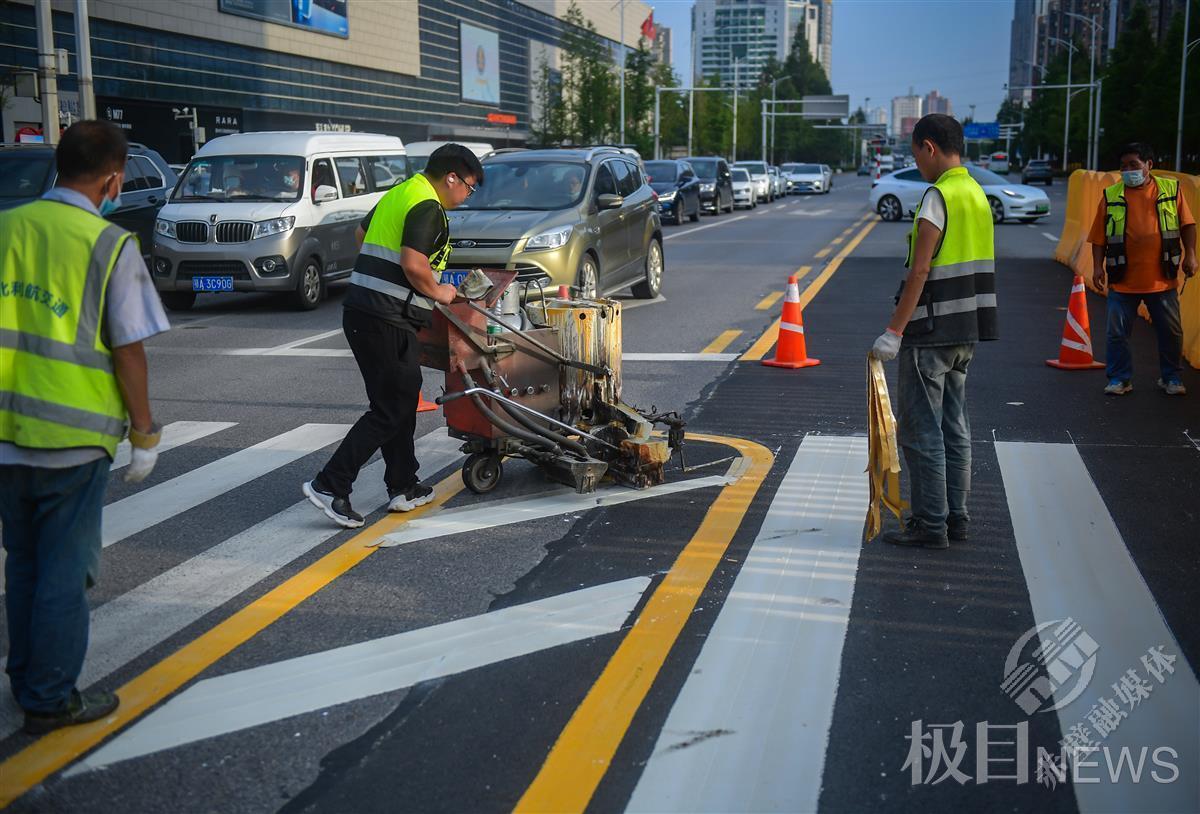在武汉市武昌友谊大道新河街附近的十字路口,4名穿着反光背心的工作人员,冒着烈日操作机械,在新修补好的马路上,推着热熔手推车,细致地描绘着斑马线。小推车过后,便是漂亮的白色斑马线。