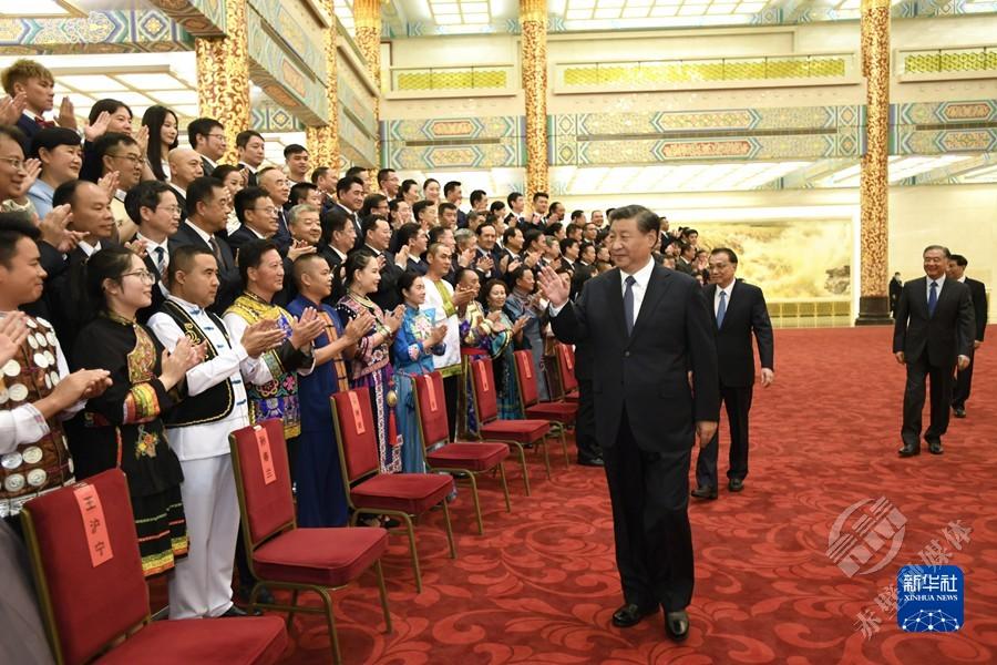 8月31日晚,第六届全国少数民族文艺会演开幕式文艺晚会在北京人民大会堂隆重举行。习近平、李克强、汪洋、王沪宁等党和国家领导人出席观看。这是演出开始前,习近平等会见文艺会演演职人员代表、组委会成员、56个民族的优秀基层党员代表等。新华社记者 李学仁 摄
