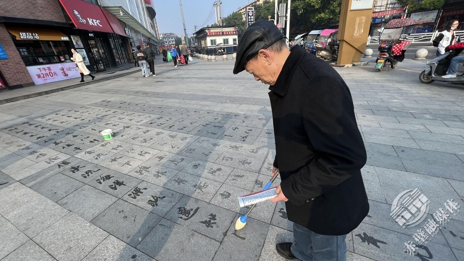 只见老者以水为墨以地为纸,笔走龙蛇,特制的长笔在他的手中显得格外灵巧。只消片刻,一个个隽丽的汉字就浮现在地砖上。老人介绍,“地书”是一种很好的书法形式,从自身出发,写地书可以活动四肢,健体练脑,陶冶情操;从文化角度来看,地书能很好地传播我国的优秀传统文化,激发孩子们对书法的兴趣。