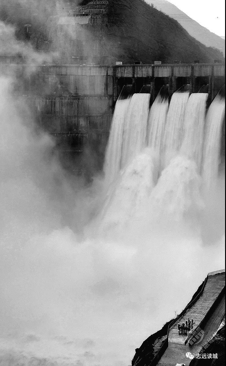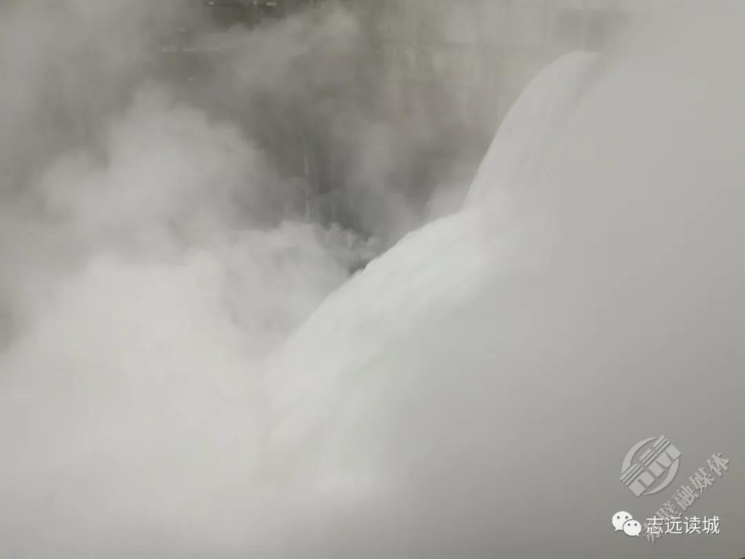 6个表孔并非一字排开,而是错落有致。6条白色长龙欢腾着,跳跃着,从200多米的高空飞奔而下,重重地砸在坝底的岩石上,激荡起巨大的水花,又被温暖的气流裹挟着,形成大团的雾气,在谷底升起,缓缓飘向山顶。这,就是昨晚我们看到的山谷中那团雾气。