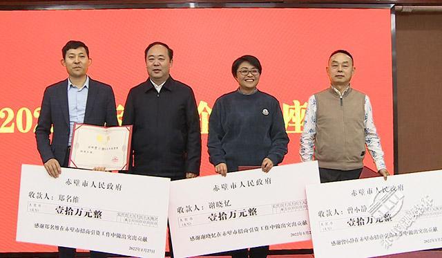 葛军现场为谢晓忆、郑名维、曾小静等“招商大使”颁发荣誉证书和奖金,感谢他们为赤壁招商引资工作做出的贡献。
