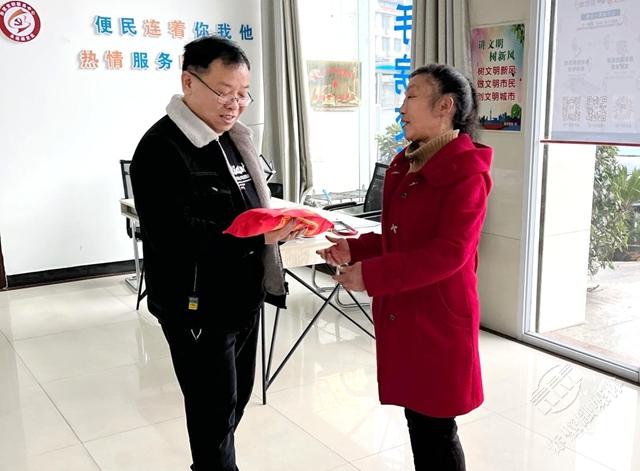 3月1日一大早,陆水社区居民王六零将一面写着“尽职尽责关爱百姓,无微不至体察民情”的锦旗送到社区,感谢社区给予她的关怀和帮助。