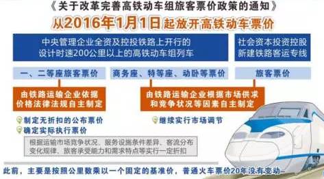 去年,国家发改委发布的《关于改革完善高铁动车组旅客票价政策的通知》指出,将从2016年1月1日起放开高铁动车票价,改由中国铁路总公司自行定价。此举意味着今后高铁票价将告别“一成不变”,逐步走向市场调节。