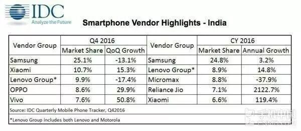 在最近第三方数据调研机构Counterpoint Research发布的报告显示,2016年第四季度印度市场智能手机出货量前五名中,中国手机厂商占据四席,分别是小米、联想、OPPO、vivo。