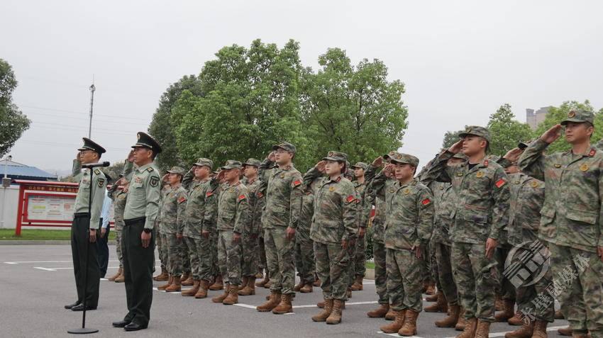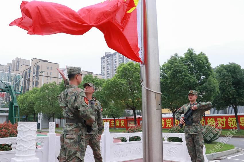 “升国旗,奏唱国歌!”升旗仪式现场,擎旗手展旗,国旗瞬间飞扬。伴随着慷慨激昂的《义勇军进行曲》,鲜艳的五星红旗冉冉升起,全体人员向国旗敬礼,表达对祖国热爱之情和矢志强军远大理想。
