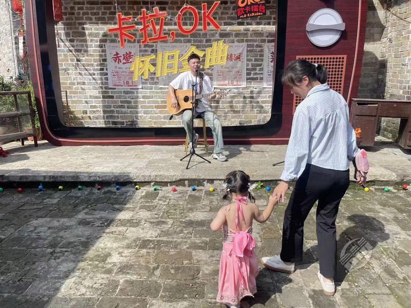 这个国庆中秋双节假期,赤壁围绕“到赤壁,吃关刀鱼!听怀旧老歌!”特色主题,在赤壁古战场、羊楼洞古镇、陆水湖、万亩茶园等4大景区以及城区的蒲圻古城推出“欧卡擂台”老歌欢唱活动,并以赤壁特色关刀鱼为核心打造地方美食体验,吸引众多游客沉浸式参与其中。大志正是由乐队安排而来,在羊楼洞古镇景区“欧卡擂台”担任主唱,营造氛围。