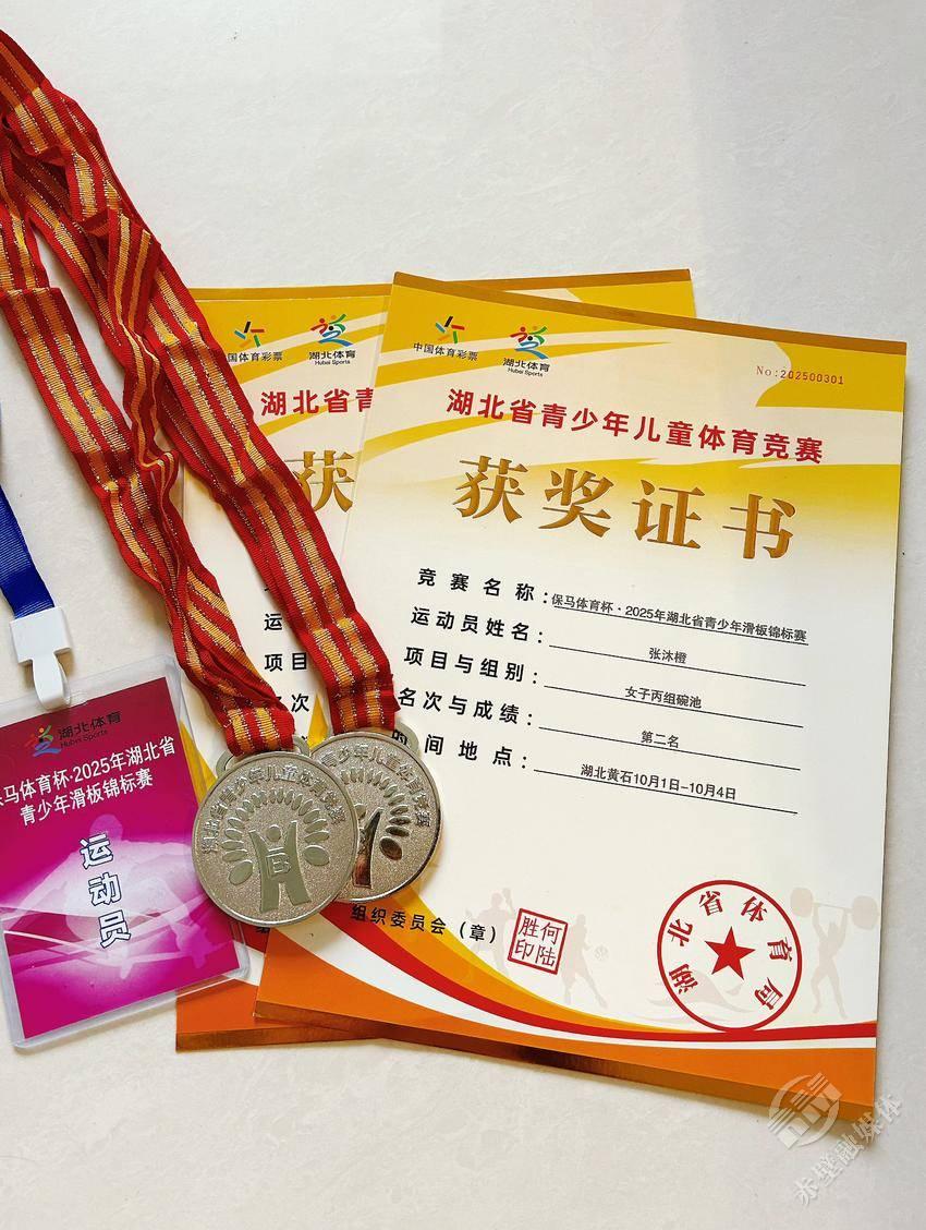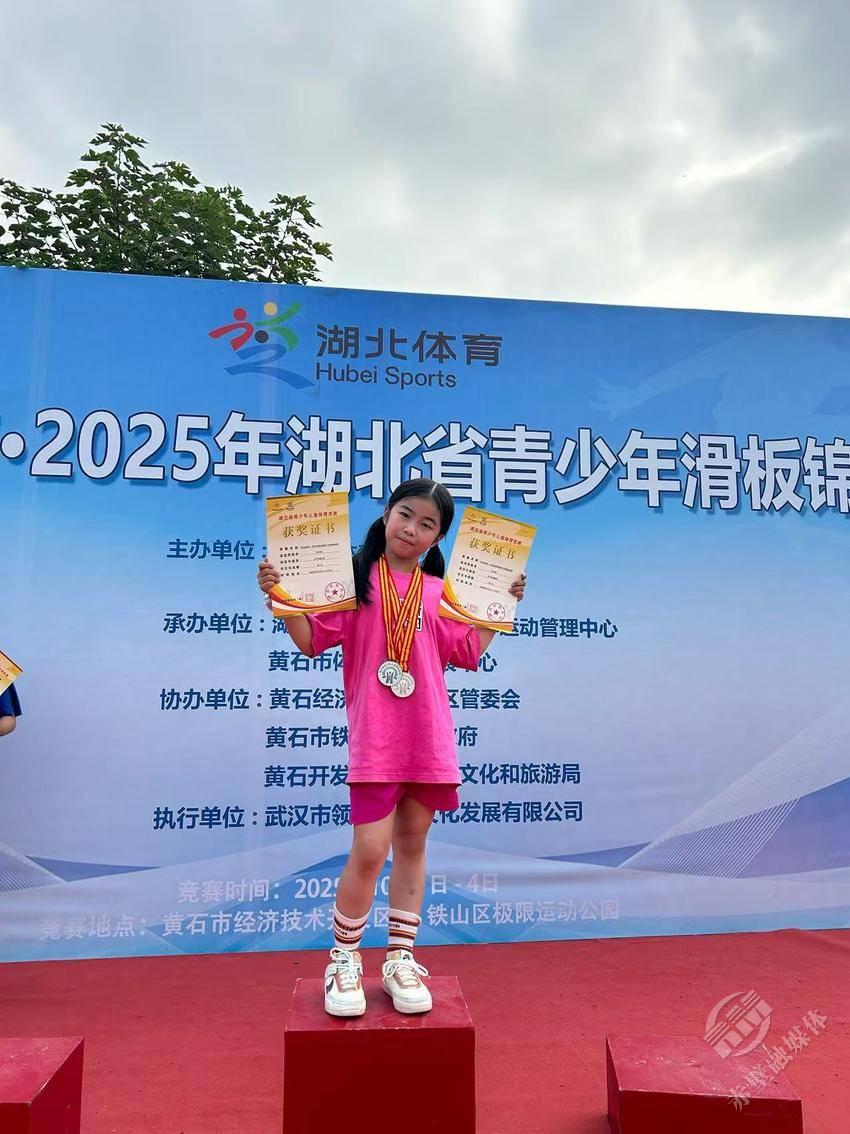 滑板的轮子飞速转动,小丫的热爱永不停歇。近日,赤壁市实验小学传来喜报!该校三年级的张沐橙同学在2025湖北省青少年滑板锦标赛中,一举拿下碗池、U池两个项目的银牌,成为赛场上亮眼的“双料新星”。
