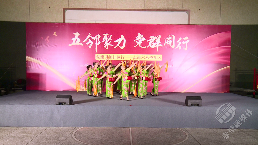 活动在开场腰鼓舞《中国美》中拉开序幕。戏曲舞蹈《梨花颂》、三句半《瞧,六米桥社区这变化》、健身操《文明在哪里》、手鼓舞《美丽中国》等15个节目轮番上演,传递出党群同心、邻里和睦的浓厚氛围,彰显了新时代社区居民昂扬向上的精神风貌。演出过程中还穿插了“党建知识”有奖问答,让居民在交流互动中加深理解,现场热情持续高涨。