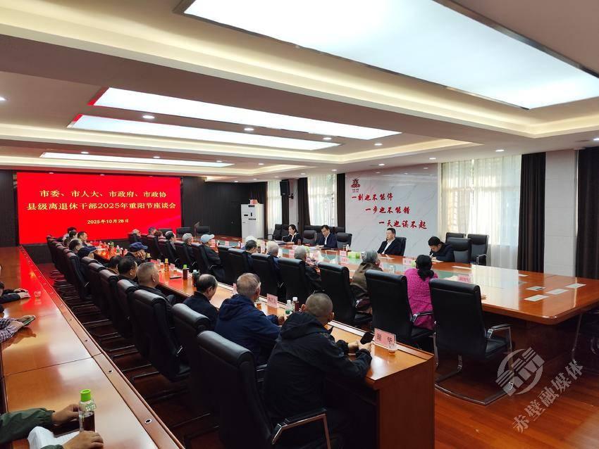 10月28日下午,赤壁市召开2025年重阳节县级离退休干部座谈会,通报全市经济社会发展情况,听取意见建议,共话未来发展。受市委书记董方平委托,市委副书记、市长彭光平出席并讲话,市委常委、市委办公室主任别华中主持会议,副市长欧阳萍、戴峰参加。