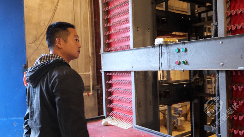 10月30日,记者走进赤马港街道陆逊湖村湖北亿凤生态养殖有限公司,数万只鸡喧嚣吵闹声不绝于耳。鸡舍内自动化设备正在投喂饲料、调节室温、清理粪便,一枚枚鸡蛋被传送带输送到分拣区,工作人员忙着按照规格将鸡蛋分装到包装盒中。