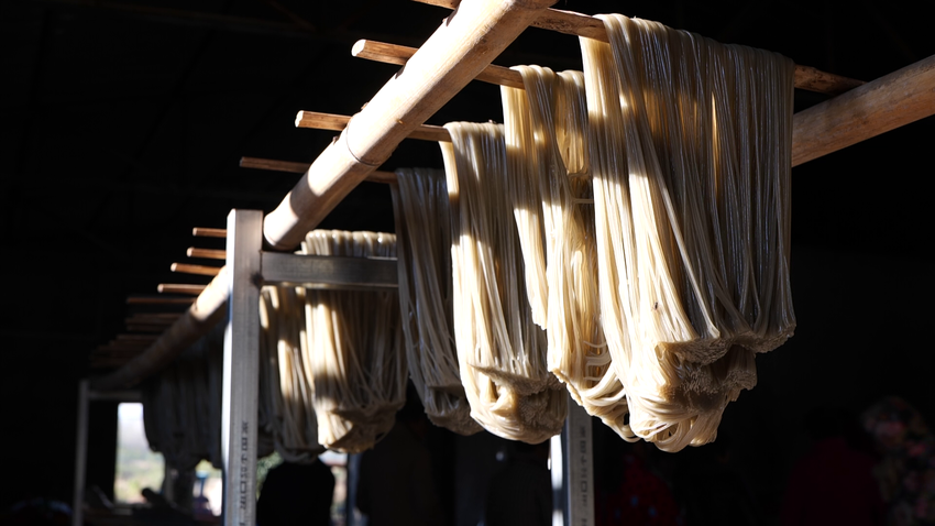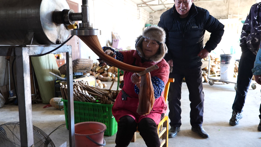 苕粉又称线粉,身如细线,色泽晶亮,需经历清洗、磨浆、沉淀、煮制、晾晒等多道工序。这一传统手艺较为烦琐,往往需要好几个人通力协作才能完成。老板邵际新引进生产设备后,工作效率比以往翻了好几番。“新生产设备实现了半机械化处理,可以节省一部分的人工,加工费用也能降低不少。”