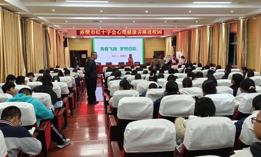 11月21日,赤壁市红十字会心理健康志愿服务队走进市第五初级中学,为200余名九年级学子开展“青春飞扬,梦想启航——中考赋能”心理公益课程。