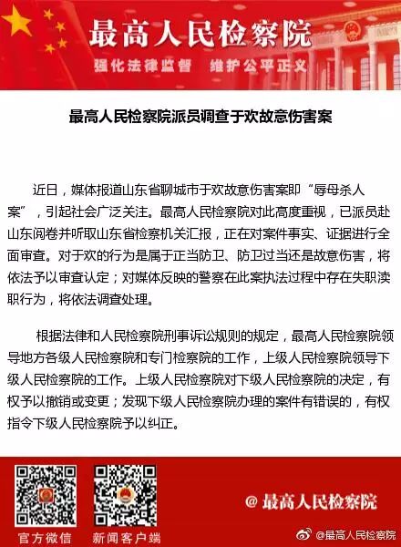 近日,媒体报道山东省聊城市于欢故意伤害案即“辱母杀人案”,引起社会广泛关注。最高人民检察院对此高度重视,已派员赴山东阅卷并听取山东省检察机关汇报,正在对案件事实、证据进行全面审查。对于欢的行为是属于正当防卫、防卫过当还是故意伤害,将依法予以审查认定;对媒体反映的警察在此案执法过程中存在失职渎职行为,将依法调查处理。