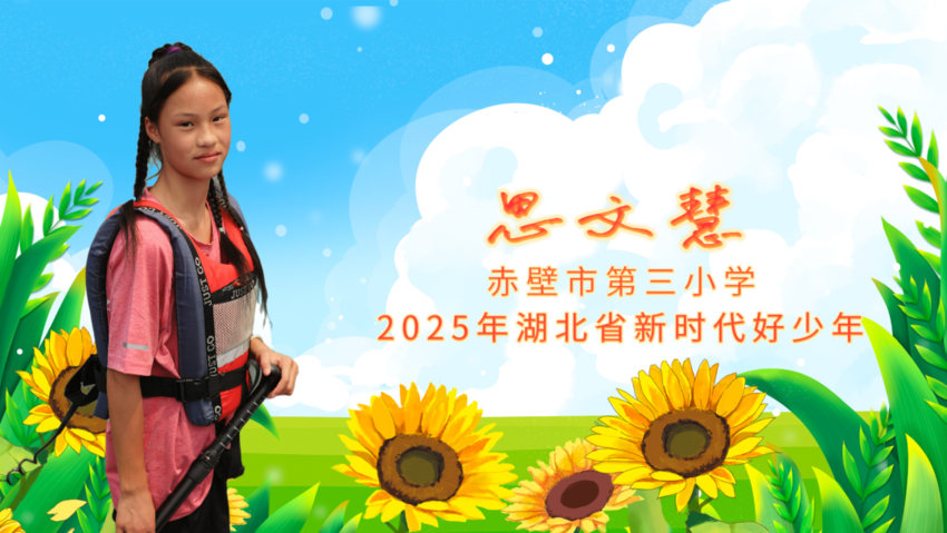追求卓越体育精神的思文慧,来自赤壁市第三小学。她朝气蓬勃,以自立自强的品格,屡次在全国桨板比赛中获佳绩。她追求卓越的体育精神,生动诠释了新时代好少年的内涵。她亦是2025年湖北省“新时代好少年”获得者。