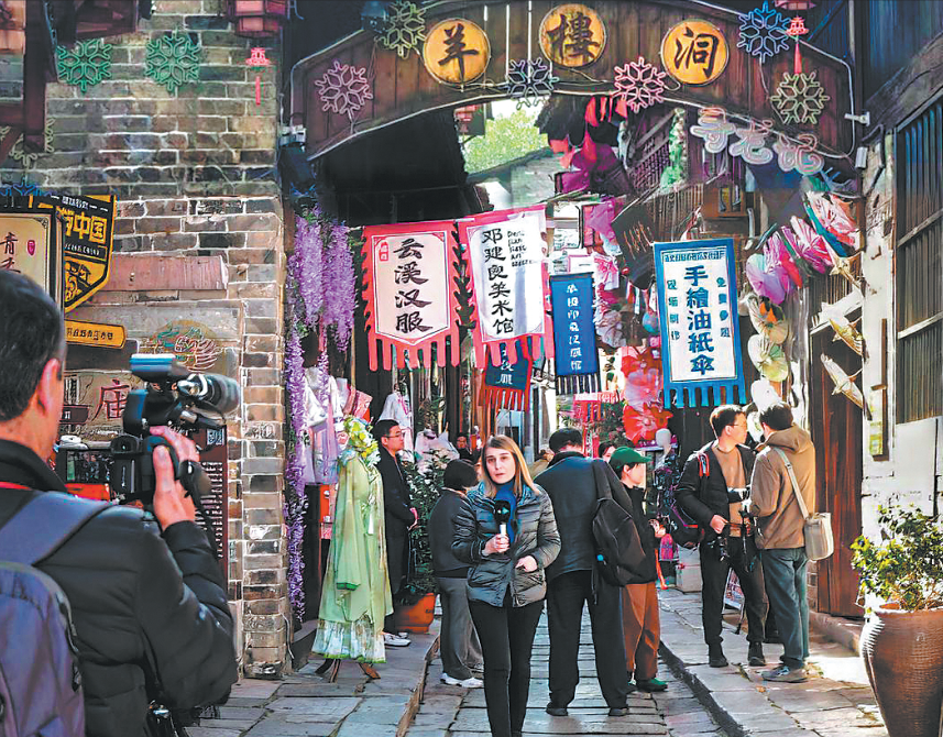 脚下是被当年运茶的“鸡公车”碾压出深槽的青石板,身旁是保存完好的明清民居,来自各国的记者们换上了汉服与中国传统簪花造型,化身古镇来客。几位外籍女记者手持油纸伞,在斑驳的古墙下回眸一笑。