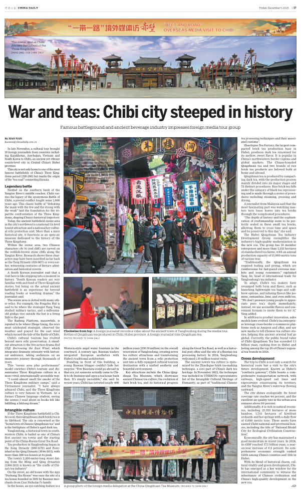 近日,“一带一路”境外媒体访赤壁采访活动引发广泛关注,《中国日报》特刊发整版英文报道《历史与茶香的交响:赤壁,一座连通古今世界的城市》,聚焦赤壁的文化魅力与发展活力,相关内容同步在中国日报网、中国日报客户端等平台上线,向全球受众传递赤壁风采。