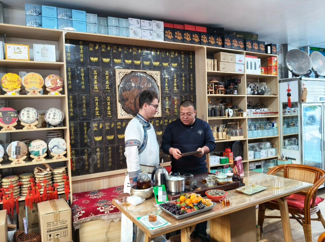 店铺里,传统大块砖茶与巧克力砖、袋泡茶等新品相映成趣。一位蒙古族大叔用不太流利的汉语说:“从小就喝这个,刮油解腻,一天都离不开!” 这句话,道出了青砖茶在中老年群体中的稳固地位。