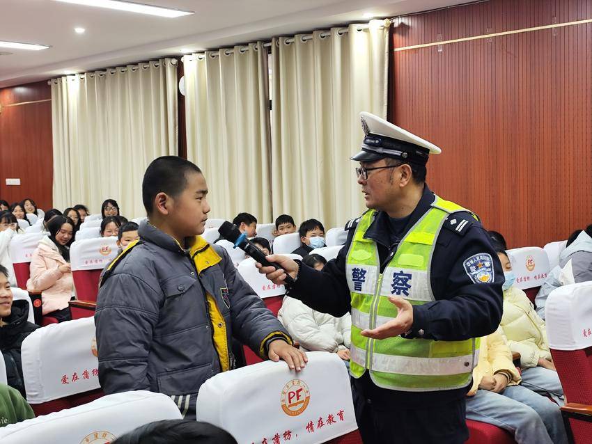 当前正值冬季低温多雨时节,电动车加装遮阳伞、防风被、雨衣等行为增多,安全隐患凸显。民警结合季节出行特点,通过播放交通安全警示片、解读交通法规、组织互动问答等方式,详细讲解过马路、骑行、乘车等安全要点,提醒师生远离车辆盲区、拒绝交通陋习。同学们踊跃抢答,主动分享收获,现场氛围热烈。