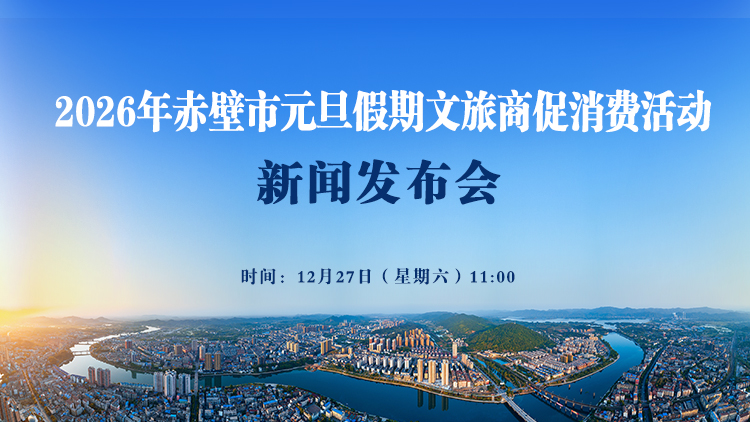 2026年赤壁市元旦假期文旅商促消费活动新闻发布会将于12月27日(星期六)11:00在市会议中心2号会议室举行,云上赤壁将全程进行直播,敬请观看!