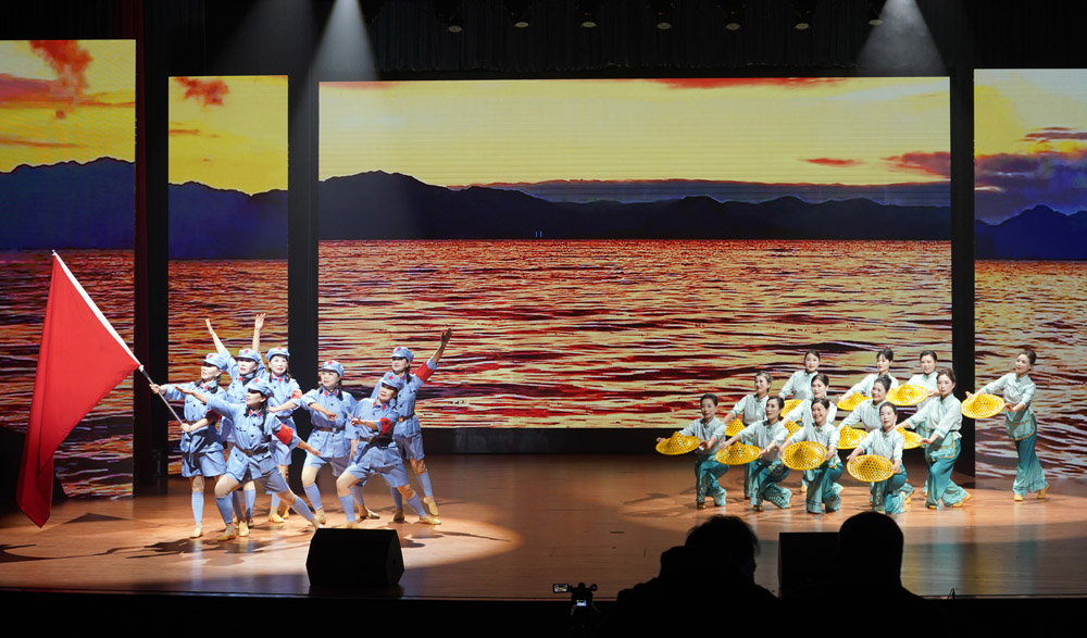 文艺展演在管乐合奏《走向复兴》的激昂旋律中拉开帷幕,瞬间点燃现场气氛。歌曲《我想去赤壁》、朗诵《赤壁·烽火与晨光的交响》、合唱《西良湖》,以丰富的表演深情讲述赤壁故事,传递对家乡的无限眷恋。
