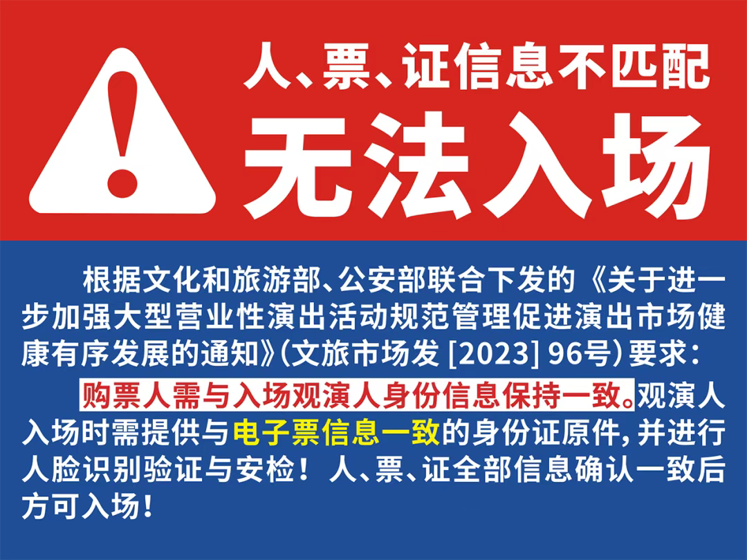 2、本次活动采用身份证电子门票,一人一证一票实名制入场,门票无法转赠及转售。入场时,必须携带门票绑定的观演人本人有效身份证件实体证件,通过安检闸机验证人脸、证件信息、门票,全部信息确认一致后方可入场观演。持港澳台通行证、护照及未成年人户口的观众可以走人工通道验票入场。