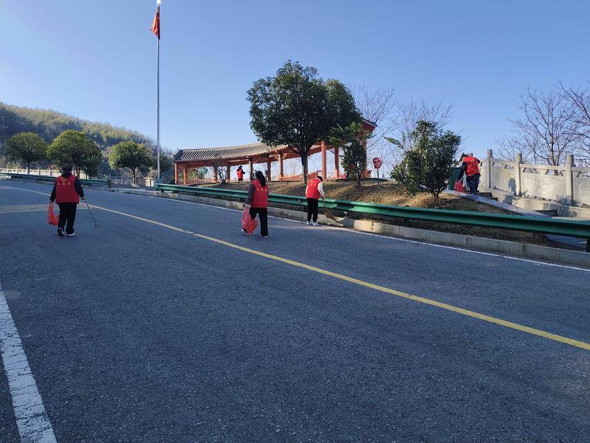 在S361大羊线芳世湾大桥,志愿者对停车区及观景平台开展集中清洁。大家仔细清扫落叶、烟头、白色垃圾等杂物,逐一擦拭栏杆、座椅,对易被忽视的卫生死角进行清理。