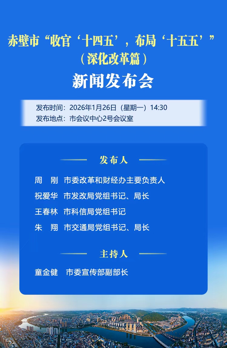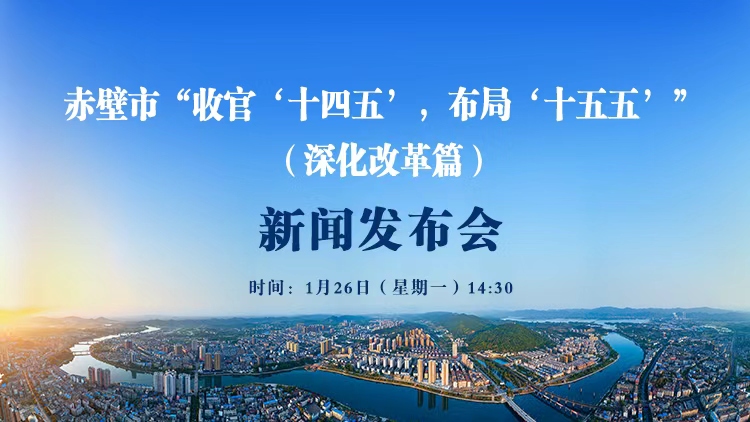 赤壁市“收官‘十四五’,布局‘十五五’” 系列主题新闻发布会(深化改革篇)将于1月26日(星期一)14:30在市会议中心2号会议室举行,云上赤壁将全程进行直播,敬请观看!