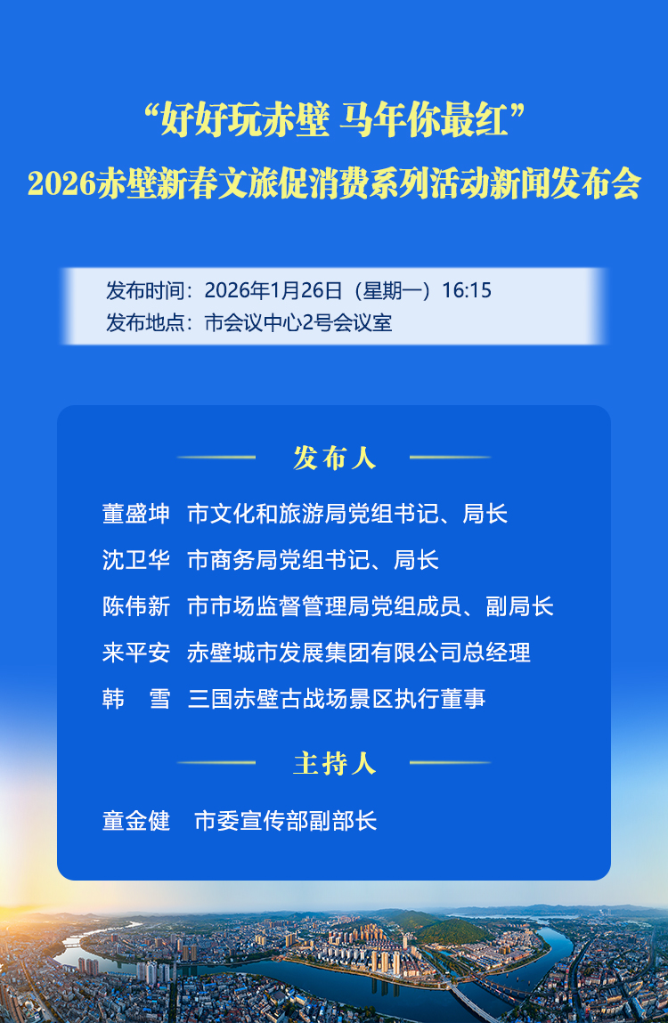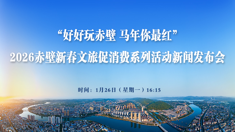 “好好玩赤壁 马年你最红” 2026赤壁新春文旅促消费系列活动新闻发布会将于1月26日(星期一)16:15在市会议中心2号会议室举行,云上赤壁将全程进行直播,敬请观看!