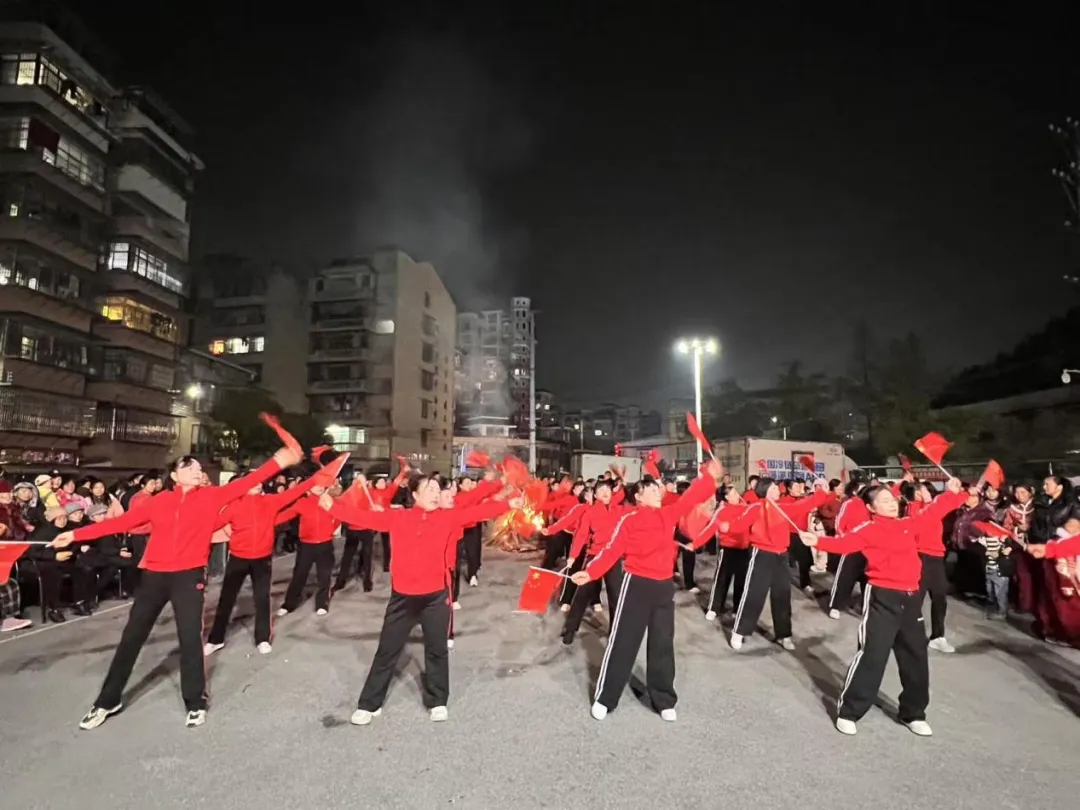 晚会伊始,社区负责人致辞送祝福,并宣讲禁燃禁放倡议,倡导居民坚守安全底线、践行文明共识。篝火映照下,居民手拉手踏歌起舞,经典红歌此起彼伏,温情暖意驱散寒意。