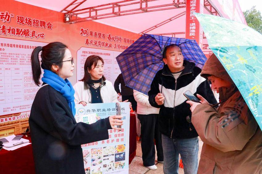 26日上午,濛濛细雨仍阻挡不住咨询应聘人员的心向往之,维达力、倍斯特、汇泉家政等企业招聘现场热度不减。刘先生之前一直在外地工作,不能兼顾工作、家庭和孩子。今年回乡过年时了解到赤壁人民广场有“春风送岗”活动,冒雨来到现场咨询。经过一番精心挑选,最终与倍斯特签下入职协议,进入试岗阶段。据倍斯特相关负责人介绍,公司在招聘过程中根据不同求职者制定了差异化工作标准,很大程度上便利了职业选择,仅25日一天便有超180人成功入职。