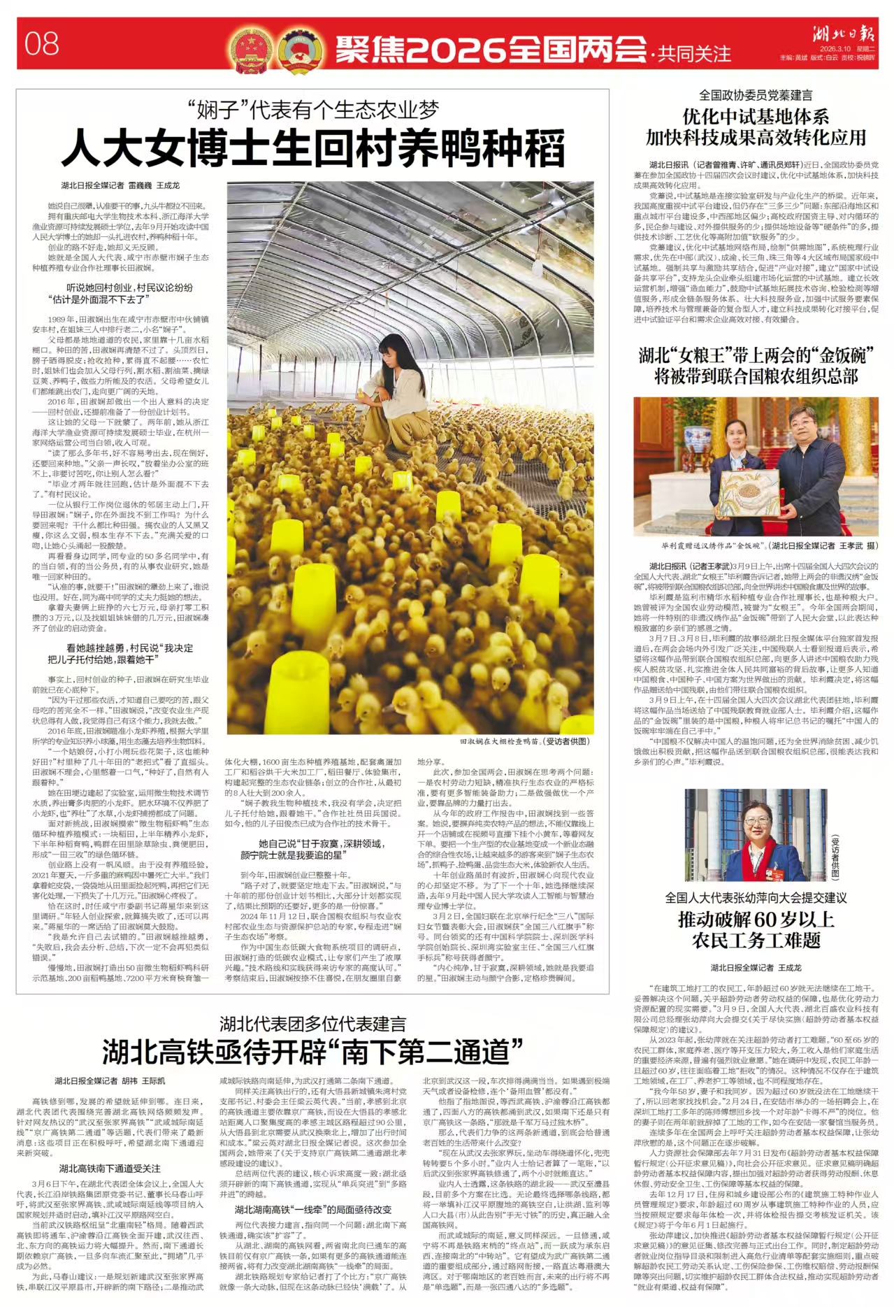 从今年的政府工作报告中,田淑娴找到一些答案。她说,要摒弃纯卖农特产品的想法,不能仅靠线上开一个店铺或在视频号直播下挂个小黄车,等着网友下单。要把一个生产型的农业基地变成一个新业态融合的综合性农场,让越来越多的游客来到“娴子生态农场”,抓鸭子、捡鸭蛋、品尝生态大米,体验新农人生活。