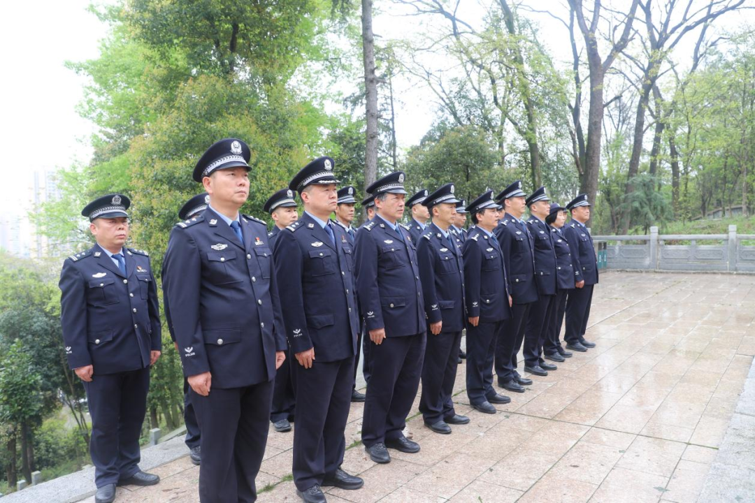 在巍峨矗立的烈士纪念碑前,全体民警警容严整、列队肃立。激昂的国歌响彻陵园,饱含着对祖国的深情与对英烈的崇高敬意。全体人员脱帽、向纪念碑深深鞠躬并默哀,现场庄严肃穆。伴随着深情的《献花曲》,两名礼兵迈着沉稳有力的步伐,护送花篮缓步走向纪念碑,表达对英烈的深切缅怀。