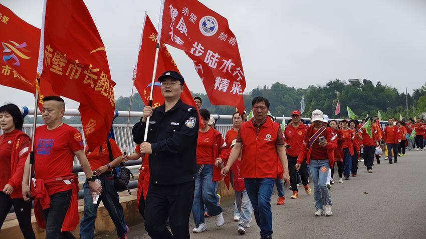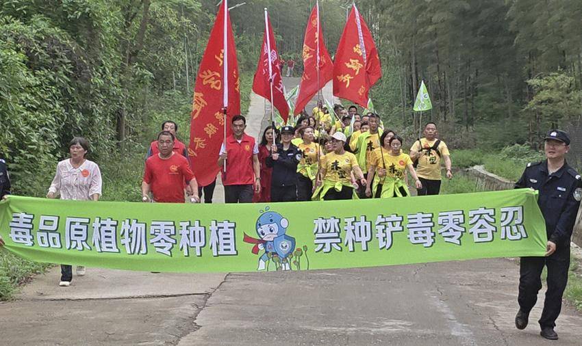 徒步过程中,市公安局禁毒大队民辅警高举“健康徒步陆水行,无毒人生更精彩”的禁毒旗帜与队伍并肩前行,参赛人员则不时挥舞印有“青春不毒行,未来更精彩”的彩旗,引得沿途市民群众纷纷点赞。