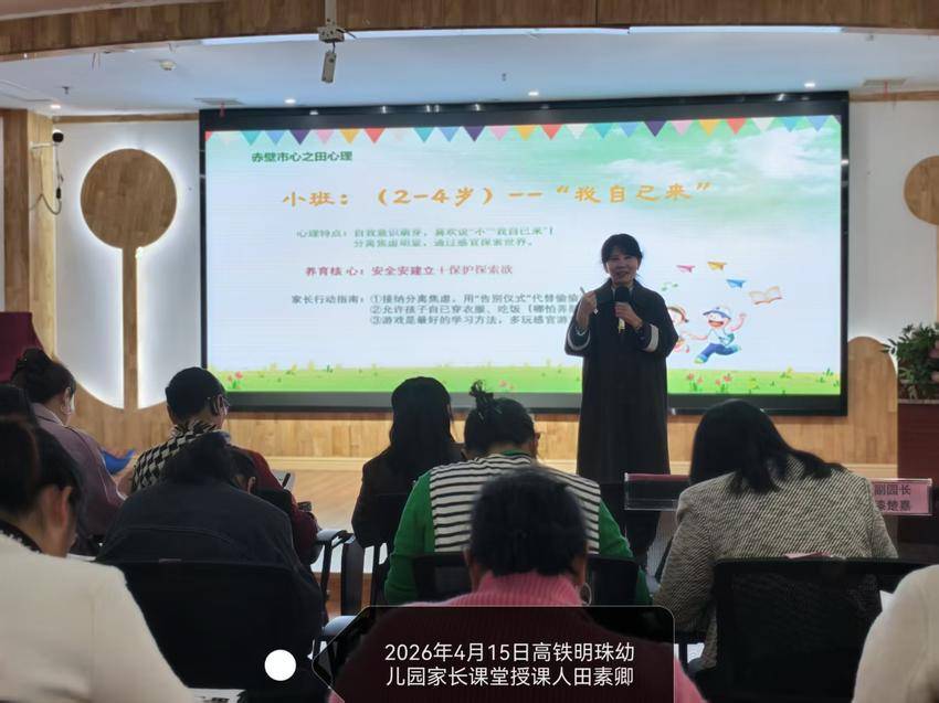 4月15日,赤壁市校外未成年人心理健康辅导中心负责人田素卿走进高铁明珠幼儿园,开展以“洞悉童心,陪伴成长”为主题的家庭教育讲座,助力家长科学陪伴幼儿成长。