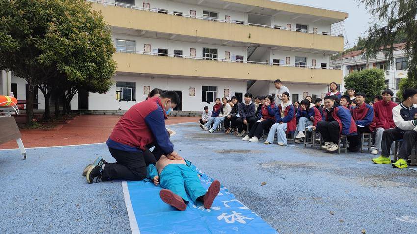 在实操教学环节,志愿者演示了溺水自救、水中托举、岸上急救等技能。同学们踊跃上台,在志愿者的一对一指导下,认真练习心肺复苏(CPR)按压频率与深度,模拟气道异物梗阻急救流程。志愿者还普及了日常摔伤应急处理、家庭常见意外处置等实用技能。