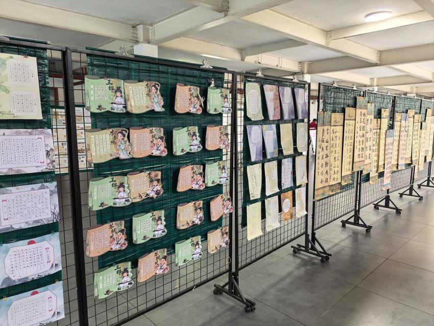 专题展示区集中呈现了同学们的阅读成果。一侧展架挂满书法作品,工整抄写着励志名言与经典诗词;另一侧展架则贴满了色彩缤纷的创意卡片,学生们将阅读感悟转化为手绘插图、人物画像与心灵话语,生动展现了对“立德”的思考与对“创新”的向往。
