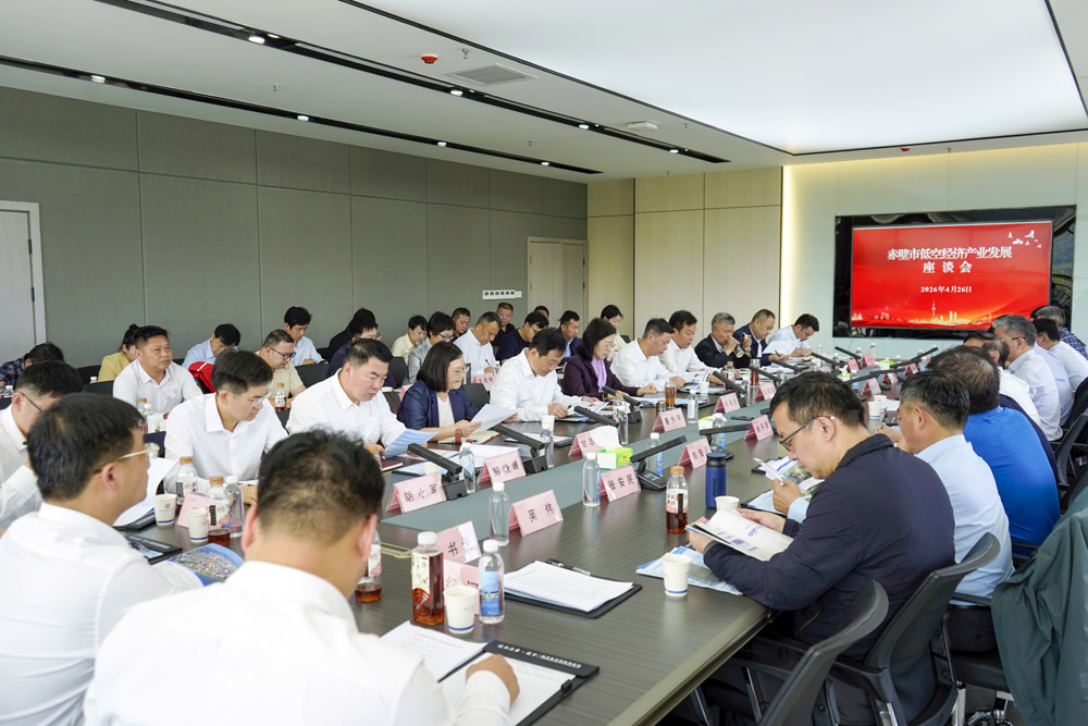 赤壁市委书记董方平主持座谈会,市委副书记、市长彭光平介绍了赤壁市经济社会发展概况及低空经济产业培育成效。