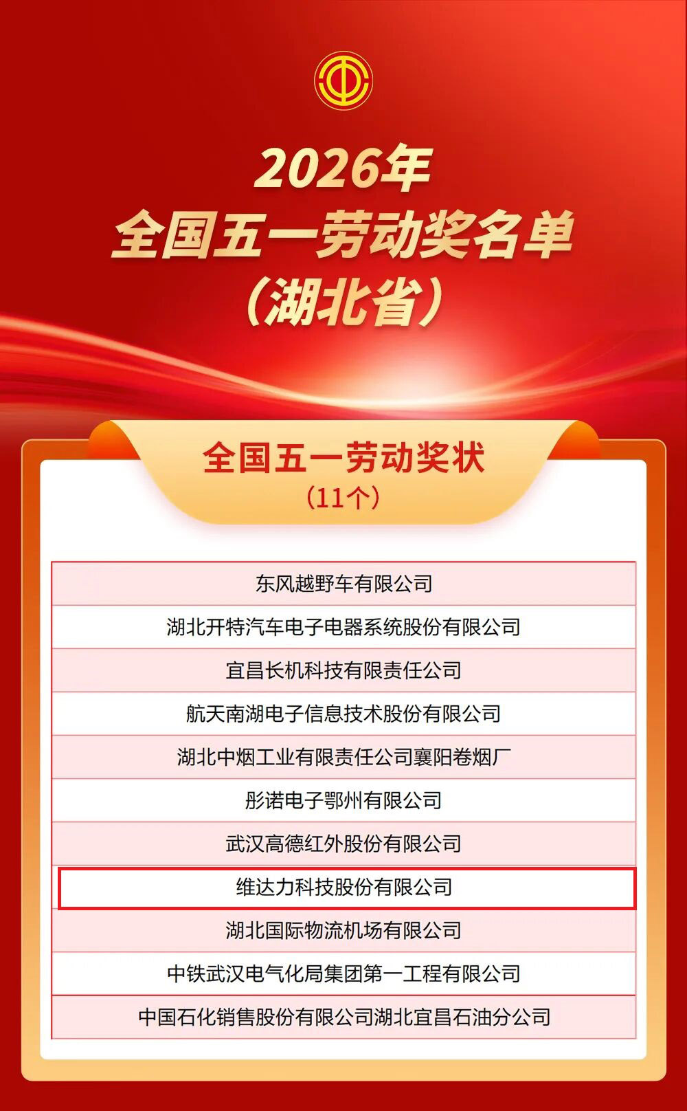 4月28日,中华全国总工会发布2026年全国五一劳动奖表彰对象名单,湖北48个集体、51名个人获奖。维达力科技股份有限公司荣获2026年全国五一劳动奖状。