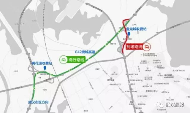 绕行方案:建议绕开武汉绕城高速盘龙城收费站,可以通行机场二通道高速黄花涝收费站进出武汉市区。