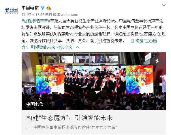 7月27日中国电信官方微博发布董事长杨杰在天翼智能生态博览会上的演讲,其中提到: