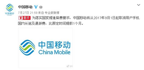 7月27日中国移动官方微博发布消息,中国移动将从今年9月1日起取消用户手机国内长途及漫游费。