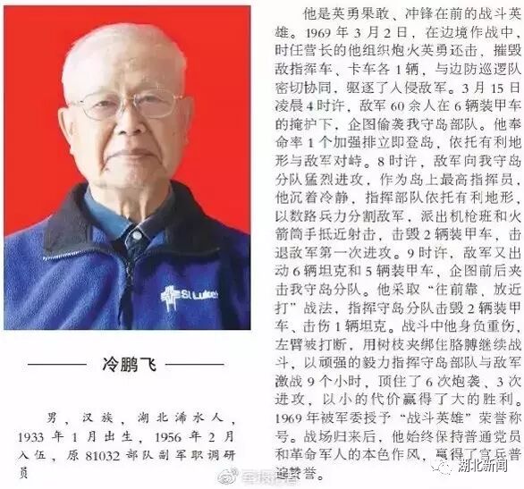 冷鹏飞,原81032部队副军职调研员,珍宝岛自卫反击战英雄营长,1969年被军委授予“战斗英雄”荣誉称号。命令指出,冷鹏飞同志是冲锋在前、英勇果敢的战斗英雄。