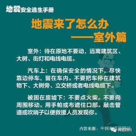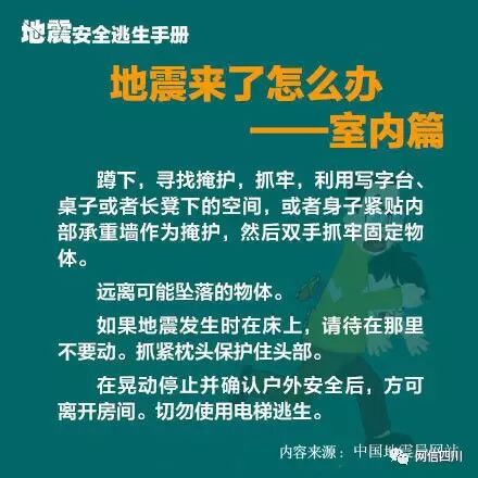【科普】地震来了我们该怎么办? 2017-08-10 09:24 咸宁发布 0 地震来了我们该怎么办? 地震虽然目前是人类无法避免和控制的, 只要掌握一些技巧, 也是可以从灾难中将伤害降到最低的, 下面就跟点妹儿一起学习一下应急避震知识吧! 学习掌握应急避震知识, 万一遭遇强震, 就能减少自己和家人的生命危险。 漫画版