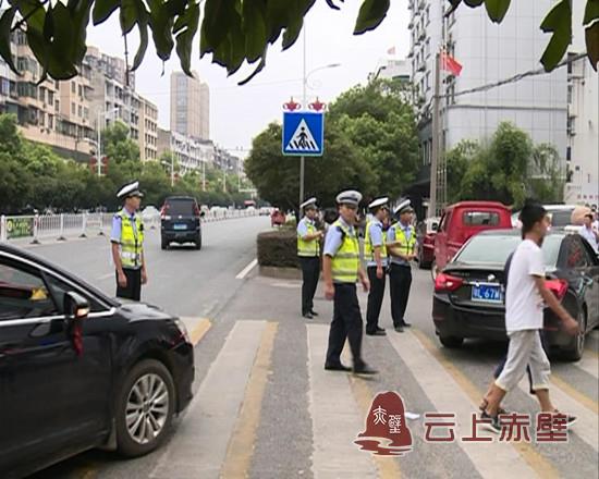 赤壁交警引导机动车驾驶员礼让斑马线行人