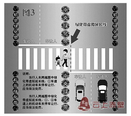 情况三:当道路中央有绿化隔离带,而行人正走在人行横道线中间、未跨越图中绿化带虚拟延长线,图中1车道上的机动车需要停车让行,2车道上的机动车可通行。当行人跨越图中绿化带虚拟延长线,1、2车道上的机动车都应当停车让行。