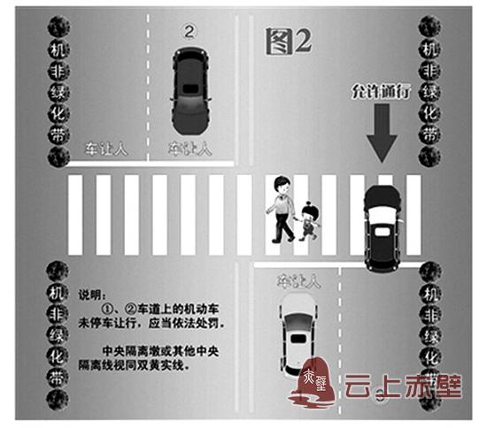 情况二:遇行人正在通过人行横道,3车道的机动车可以通行,但1、2车道的车辆应当停车让行。此情况中,当行人走到双黄线处时,面向的车辆应停车,让行人先通过。