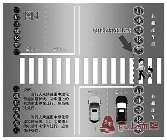 情况四:行人未跨越绿化带在双向四车道上,如图所示,当行人未跨越图中绿化带虚拟延长线时,2车道上的机动车应停车让行,1车道上的机动车可以通行,如果行人跨越图中绿化带虚拟延长线时,1、2车道上的机动车都应当停车让行。